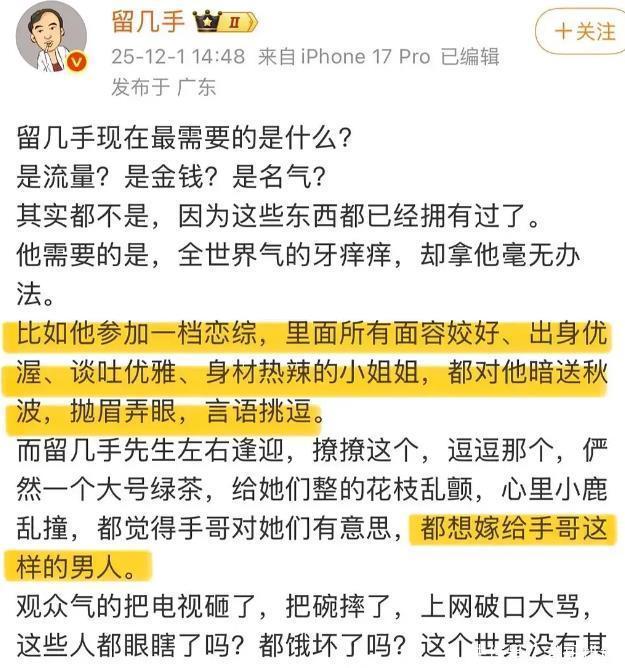 实际上,留几手在得知葛夕参加恋综时,已经发了一篇小作文,称自己现在金钱、名气都不缺,缺少的是,被全世界嫉妒。比如参加一档综艺,里面所有的小姐姐,都对自己暗送秋波,这样他可以做一个大l茶,聊聊这个,逗逗那个的。而目的则是让观众生气破防,羡慕嫉妒恨。