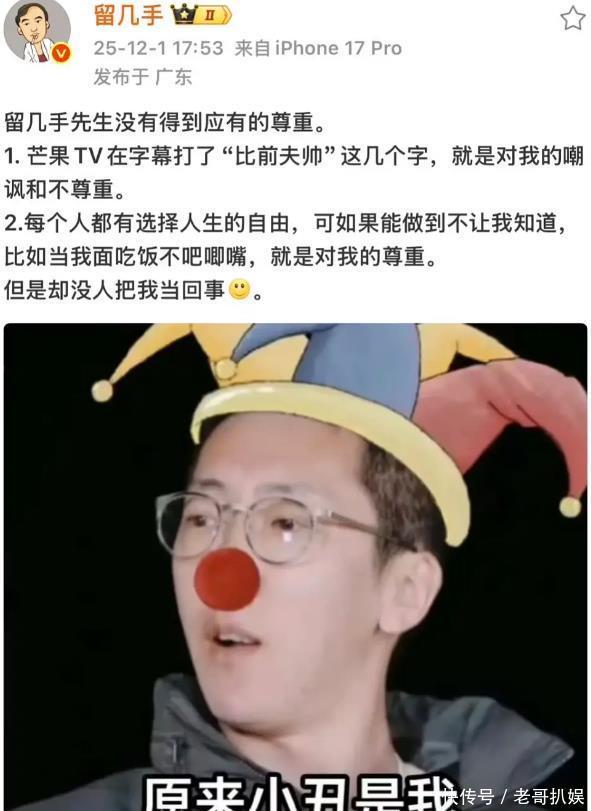 随后,留几手发文抱怨,称自己没有得到应有的尊重,芒果台字幕打“比前夫帅”是对自己无情的嘲讽和不尊重。直言每个人都有选择人生的自由,但能做到让自己不知道,比如在自己面前吃饭不吧唧嘴,就是对自己尊重,可惜没有人把自己当一回事。