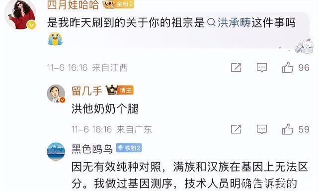 有网友称留几手这是不尊重女性,应该把玩玩两字,换成谈谈,不过留几手则回应称,自己并无不妥,是网友理解有问题。还称自己文字,任何人挑不出理。 而留几手最近比较有意思的另一件事则是,近日有知识博主称康熙并非正统血脉,而是洪承轁私生子。这让一向爱钦觉罗后人自居的留几手破防,直言活了半辈子,祖宗不是自己祖宗了。网友们也是纷纷留言调侃。